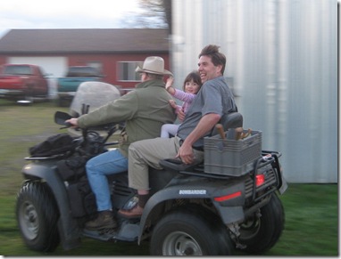 Within reason, Grandpa always accommodates Franny and Cole’s requests for a ride on the four-wheeler (Franny) or a trip out to see the horses (Cole). Given his latest reactions, Cole will probably ride a horse before he climbs on the four-wheeler, but Franny absolutely loves it, especially when she is sandwiched between two of her very favorite people. On our last soup night gathering, Grandpa pulled it out for Franny for a last-minute run. Lucky girl! It was non-stop smiles until she was forced to stop to take pictures!